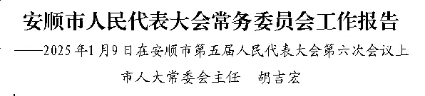 2025年,是“十四五”规划收官之年、“十五五”规划谋篇布局之年,也是进一步全面深化改革的关键之年。新的一年,市人大常委会将在市委的坚强领导下,坚持以习近平新时代中国特色社会主义思想为指导,深入学习贯彻党的二十大和二十届二中、三中全会精神,坚决贯彻落实习近平总书记关于贵州工作重要讲话重要指示精神,认真贯彻落实省委十三届历次全会和市委五届历次全会作出的决策部署,坚持党的领导、人民当家作主、依法治国有机统一,发展全过程人民民主,围绕主战略主定位,紧扣“大抓产业、大抓项目、大抓招商”工作要求,聚焦“两城三基地”建设,对标“四个机关”定位要求,认真履行宪法法律赋予的各项职责,充分发挥人大代表主体作用,为奋力谱写中国式现代化安顺篇章贡献人大智慧和力量。